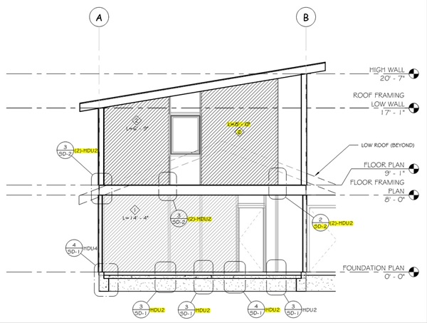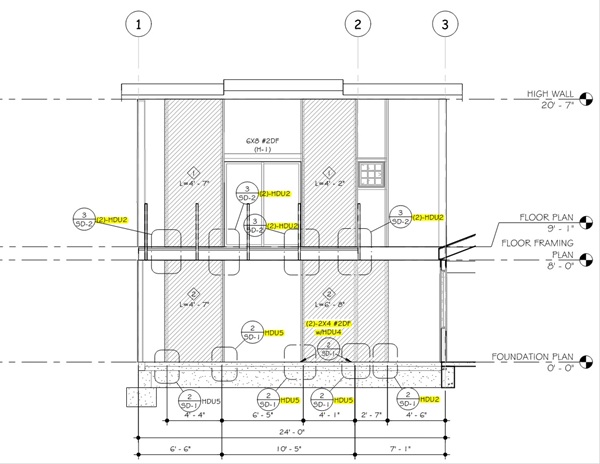 The highlighted elements represent the hold downs eleminated by considering the entire wall as a shear wall considering the openings.