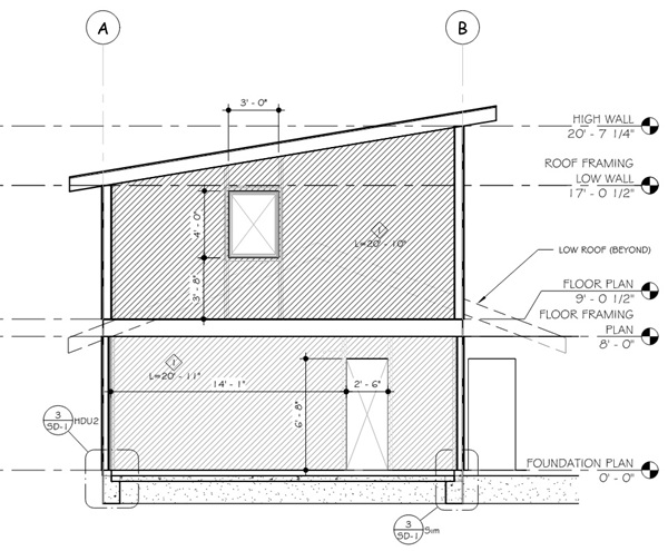 at the ends of the shear wall, not at the ends of each individual segment. Since the shear wall is longer, the uplift force at the ends of the shear wall is less. In the example below, Grid Lines A and B are bearing walls