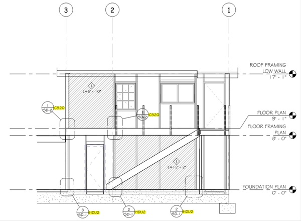 The highlighted elements represent the hold downs eleminated by considering the entire wall as a shear wall considering the openings.